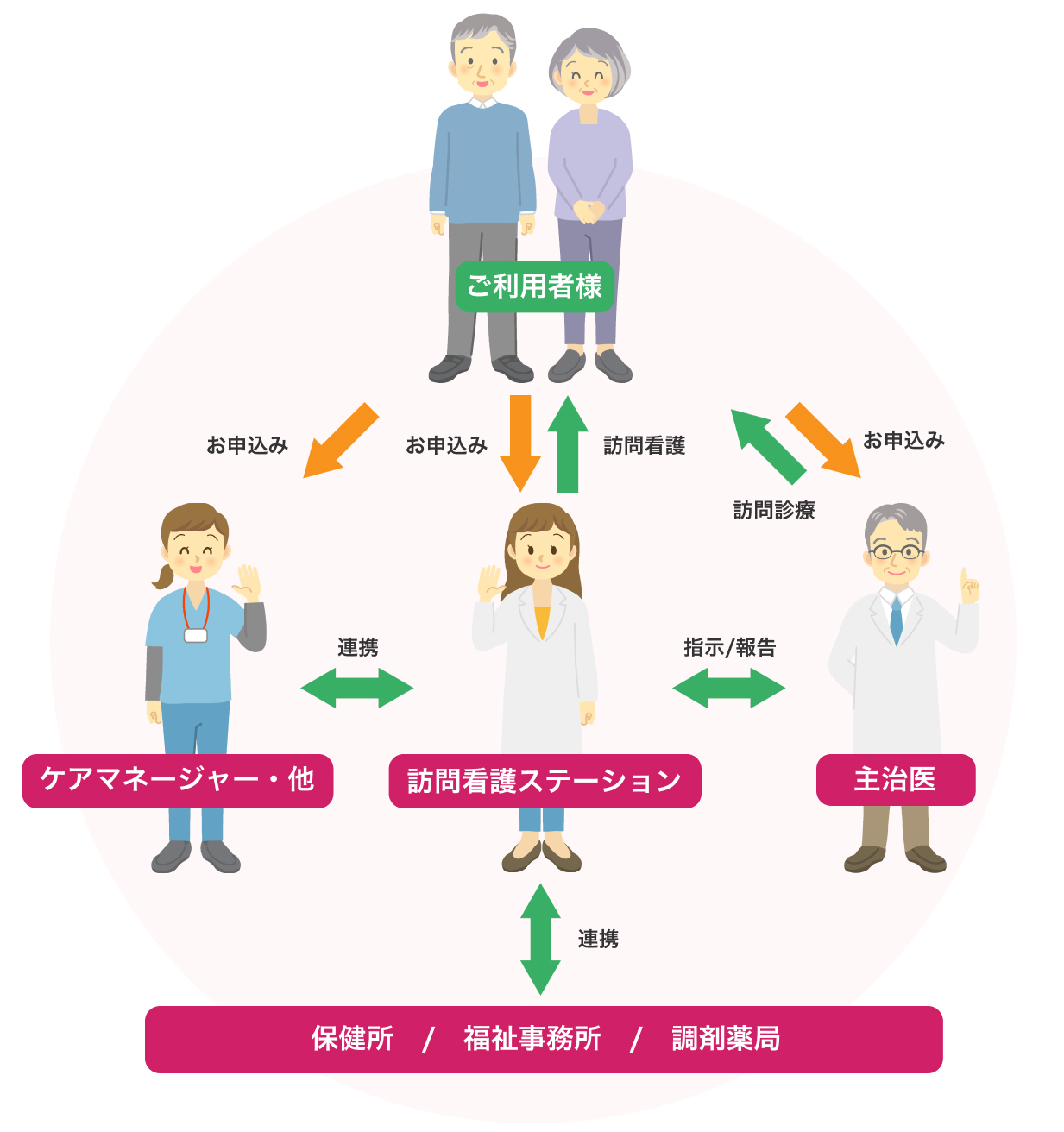 医師や関係機関と連携し、体調の変化や緊急時にも迅速に対応。看護師がご自宅を訪問し、医療的ケアや日常生活のサポートを通じて、心のこもった看護をお届けします。