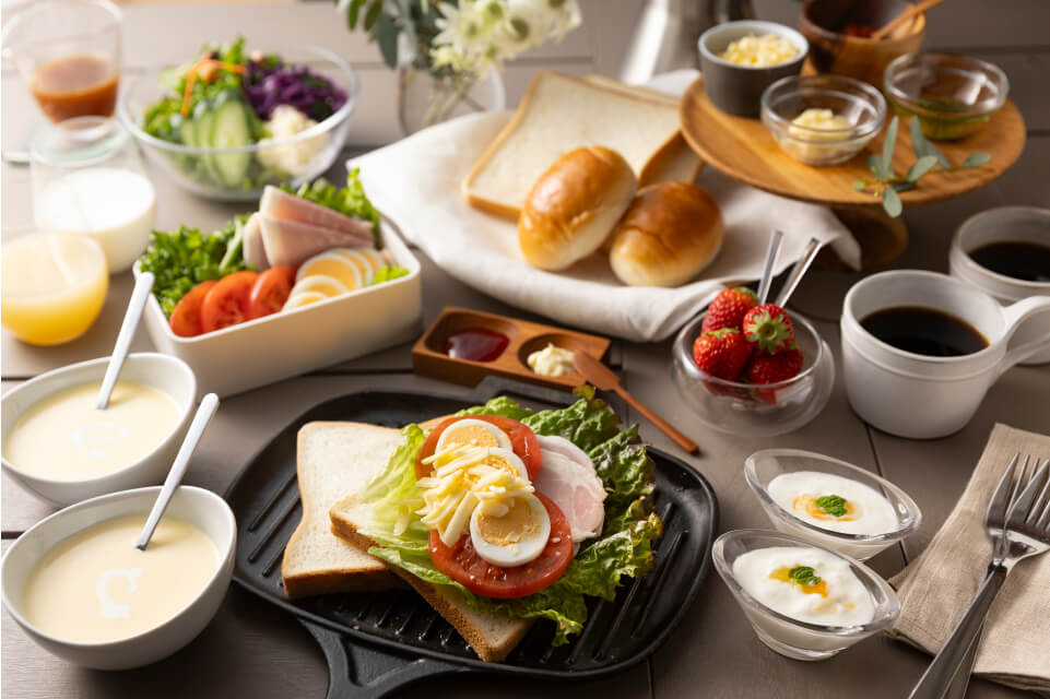 ポッポ牛乳もしくはりんごジュース、スープ、 信州の産みたて卵・新鮮な野菜・信州ハム・チーズで作る出来立てホットサンド、 彩りサラダ、高原ヨーグルト、新鮮なフルーツ