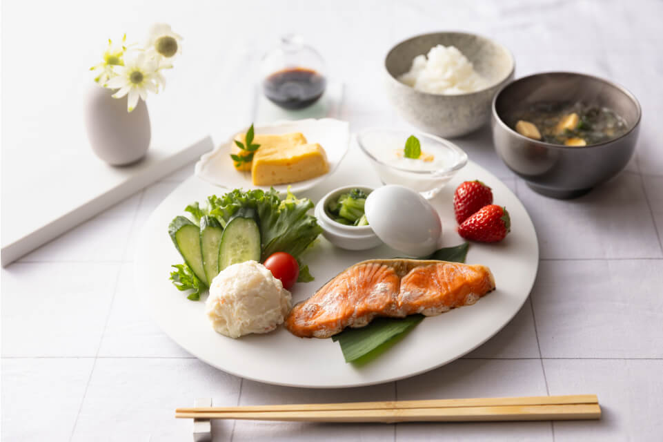 ポッポ牛乳・焼魚・五郎兵衛米・高野豆腐とわかめの味噌汁・玉子焼き・お漬物・サラダ・新鮮なフルーツ・高原ヨーグルト・ドリップコーヒー