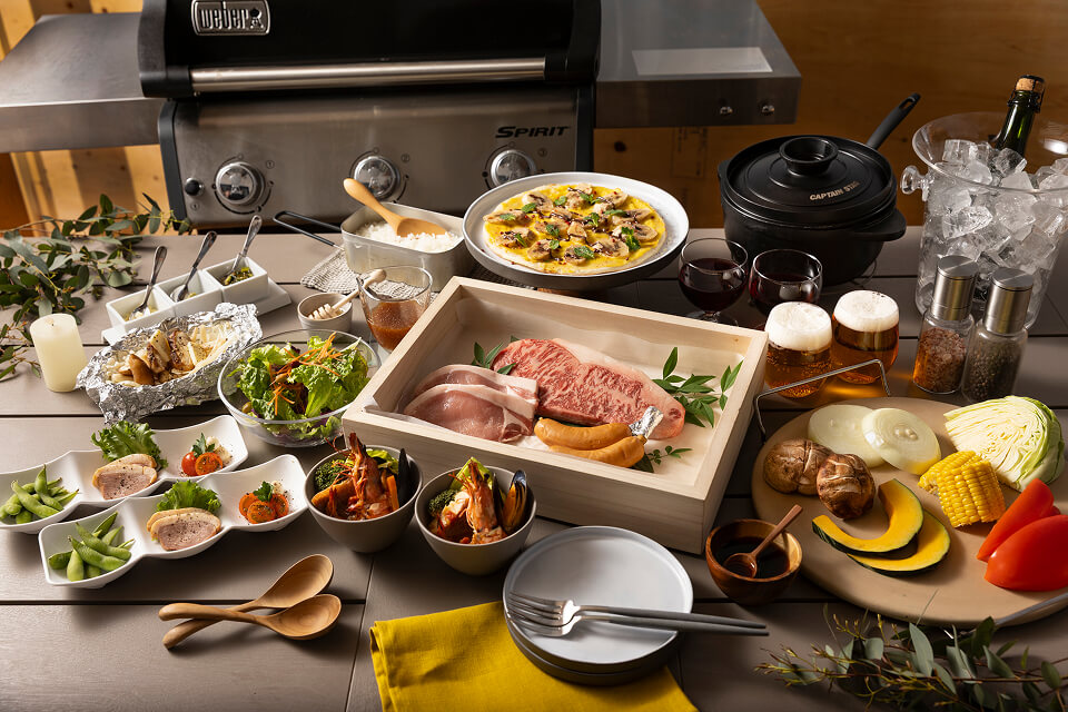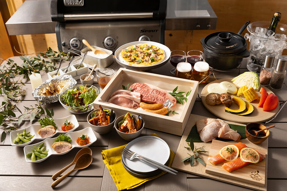 前菜3種・BBQ 蓼科牛サーロインステーキ・信州ホエー豚・信州福味鶏・ソーセージ・旬の焼き野菜・彩りサラダ・信州きのこのホイル焼き・信州サーモンの杉板焼き・魚介のトマトスープ・五郎兵衛米(五郎兵衛米コシヒカリを長野の美味しい水で炊き上げます。野沢菜を添えて)・デザートピザ