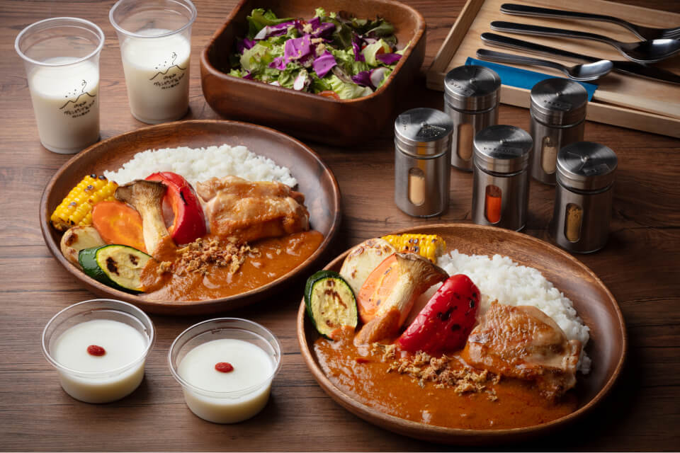 信州福味鶏、骨付きソーセージ、焼き野菜、彩りサラダ、五郎兵衛米、ラッシー、杏仁豆腐