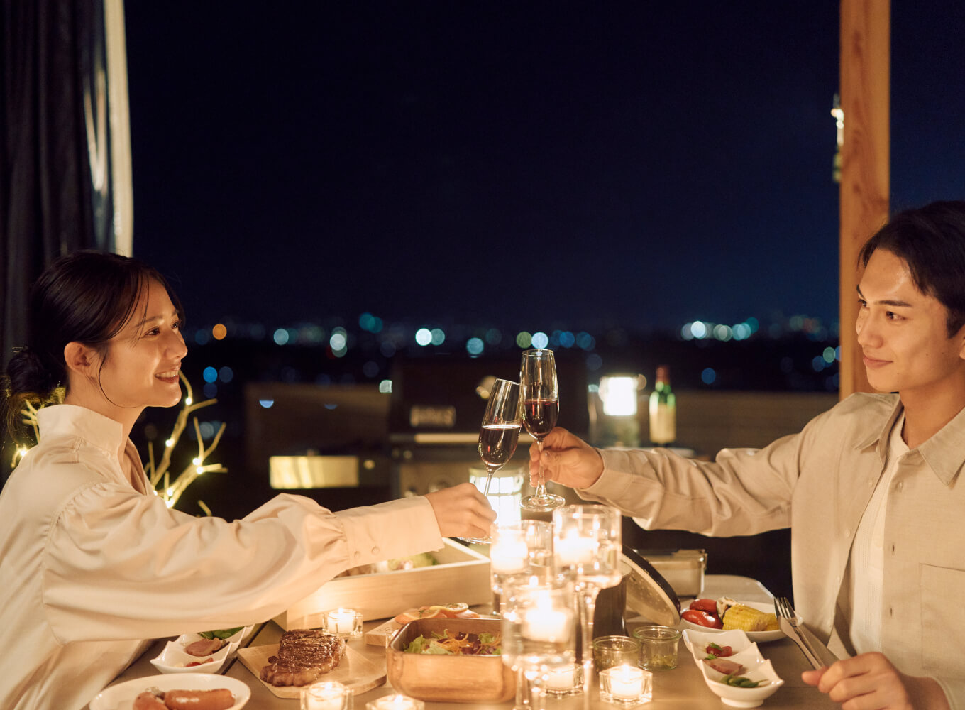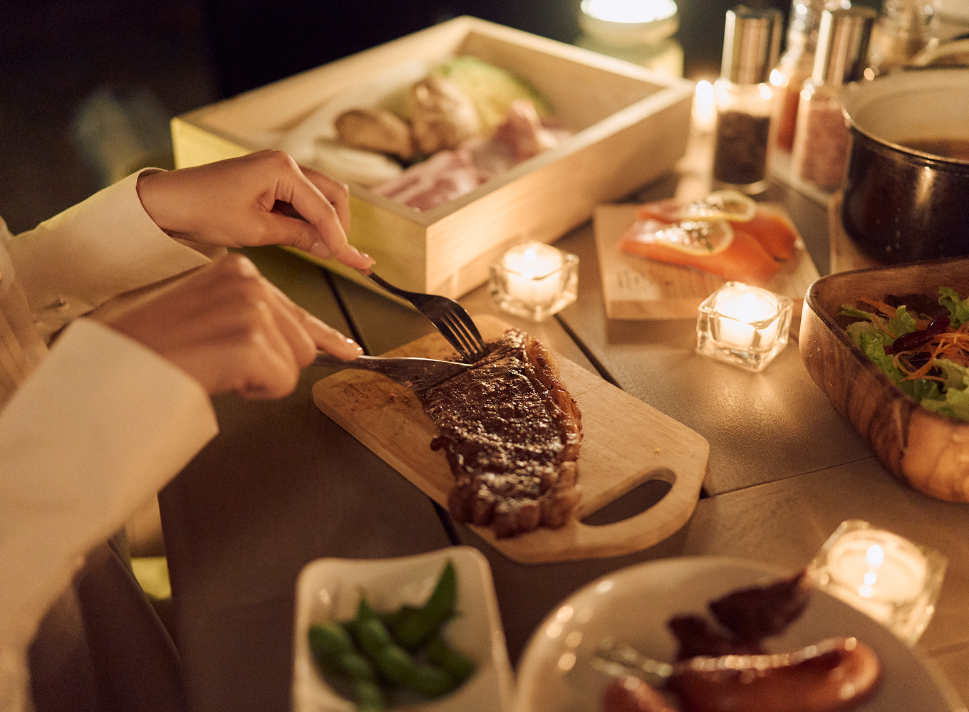 のぞみグランピング&スパが位置する信州地域のお料理を堪能していただけるメニューをご用意しております。信州満喫プランでは、蓼科牛のサーロインステーキをはじめ、信州ホエー豚、信州福味鶏など地元ならではの食材をふんだんに使用しました。長野県の名水を使用してメスティンで炊き上げる佐久自慢の五郎兵衛米もご堪能ください。