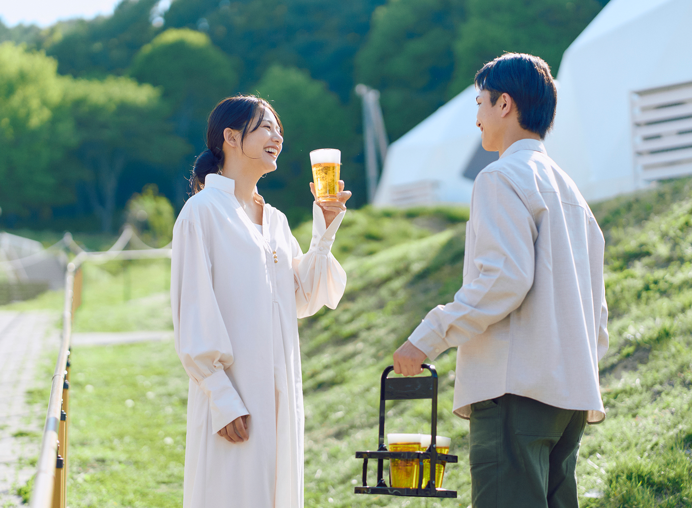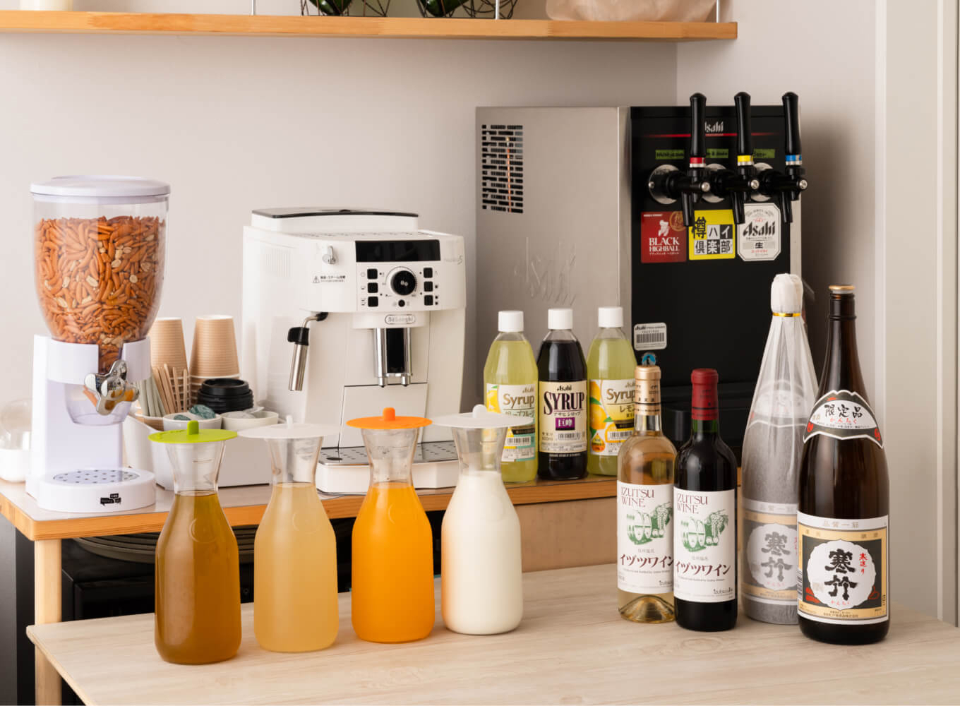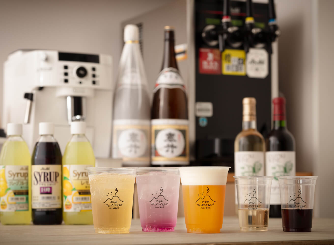 管理棟のフリードリンクコーナーには、生ビール、酎ハイ、ハイボール、ワイン(赤・白)、日本酒、ソフトドリンクなどご用意しています。お部屋に備え付けのカップでどうぞ。